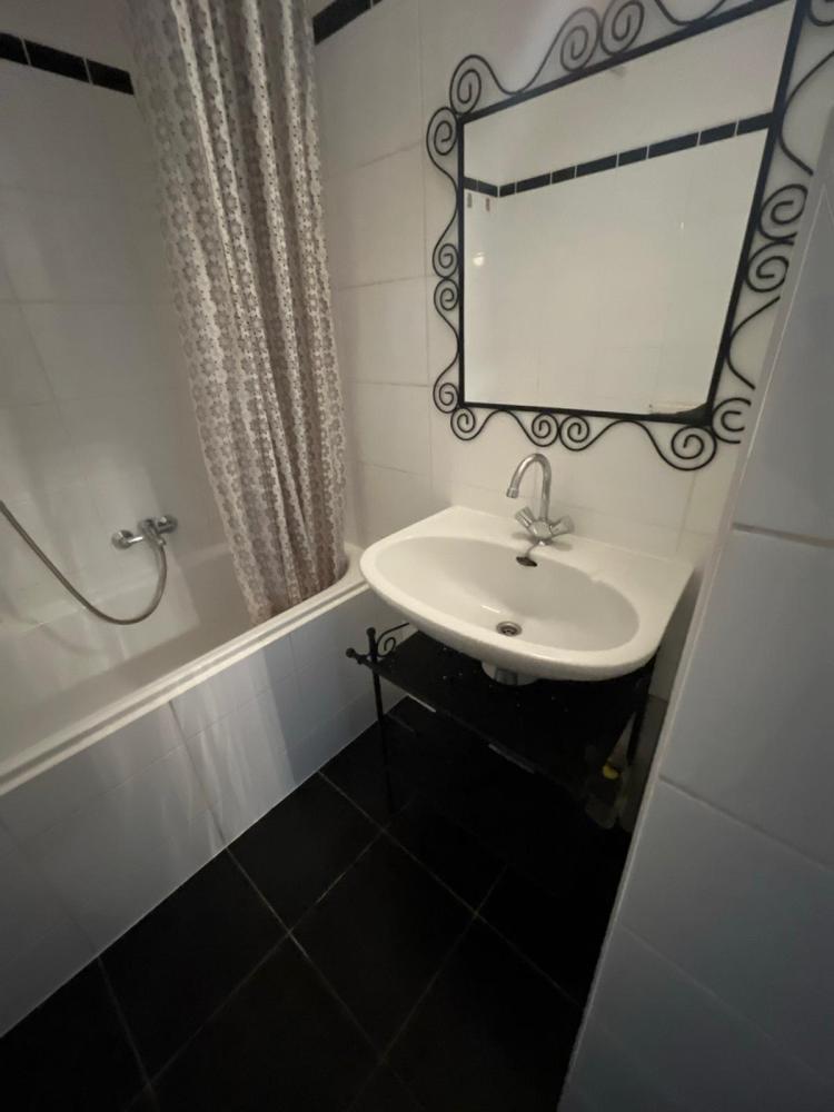 De geheel betegelde, lichte, badkamer beschikt over een fijn ligbad met douche en een fontein met spiegel.