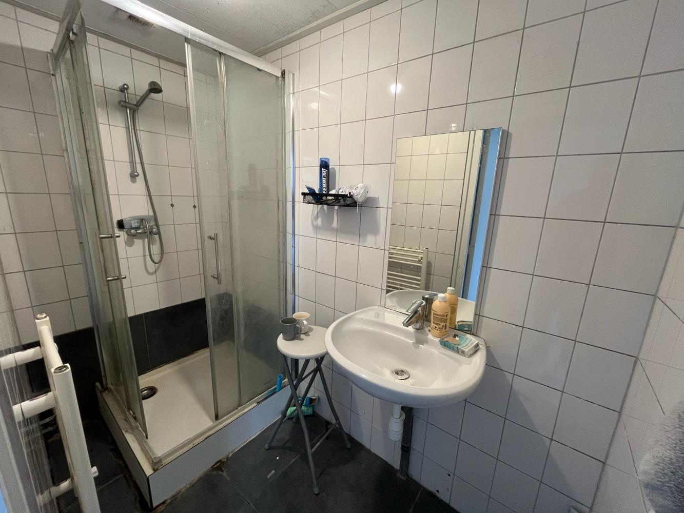 De gedeelde betegelde badkamer is voorzien van een douche en wastafel. Er is een aparte toilet aanwezig.